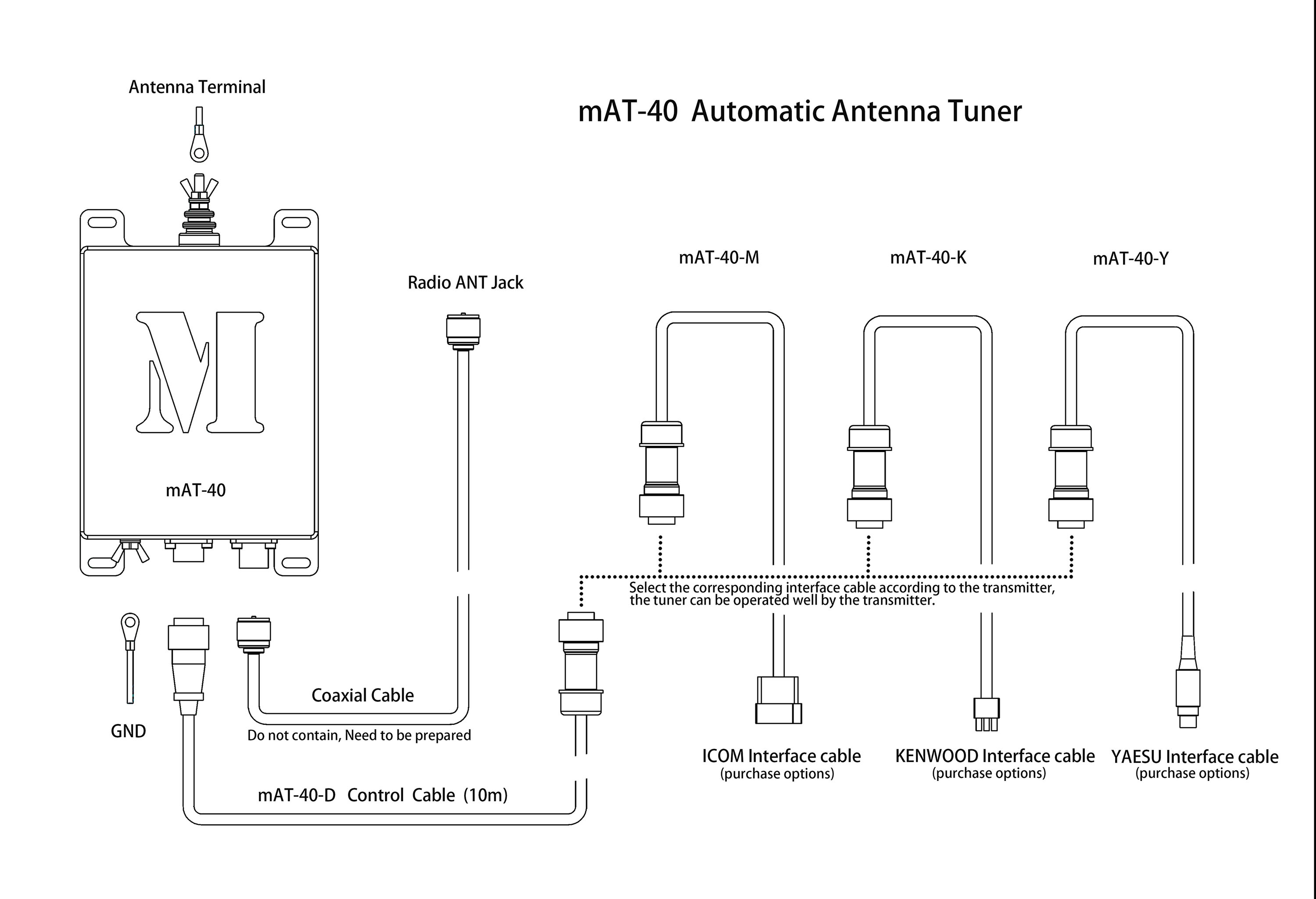天调由以下几部分组成:mAT-40主机、控制线(mAT-40-D,10米)、YAESU接口线(mAT-40-Y)、ICOM接口线(mAT-40-M)、KENWOOD接口线(mAT-40-K)。mAT-40主机和mAT-40-D控制线是必需部件,其余的接口线是可选的。您可以根据您的电台选择不同的接口线。